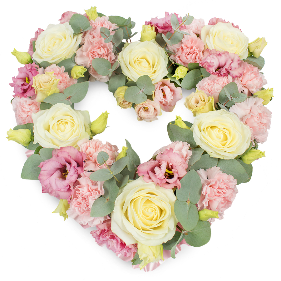 Express your heartfelt sentiments with our Charming Tribute Bouquet. This elegant arrangement features a delightful combination of white roses, pink carnations, pink lisianthus, and eucalyptus leaves, thoughtfully designed to honor and remember your loved one.