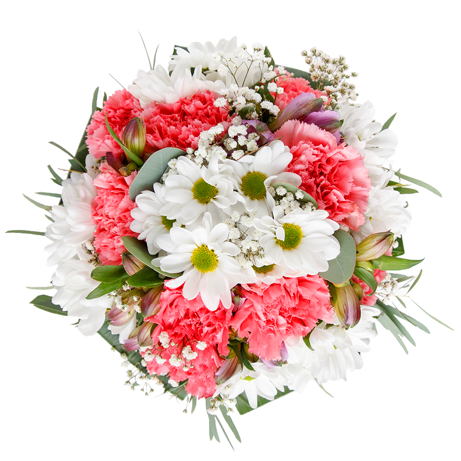 Brighten any occasion with our stunning floral arrangement, meticulously curated to inspire joy and elegance. This bouquet showcases a harmonious blend of pristine white chrysanthemums, soft gypsophila, and delicate light pink carnations, complemented by verdant aspidistra leaves. Each flower is hand-picked and selected for its exquisite freshness and vibrant appeal.
